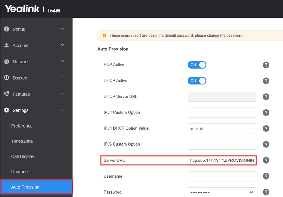 - Navigate to the url of the phone, e.g. https://<your.phone.IP> and login (default is typically U:admin P:admin), then go to Settings -> Auto Provision and then configure the 'Server URL' field shown below. The exact URL for a given customer can be determined as noted in the 'Related Info' section further below.